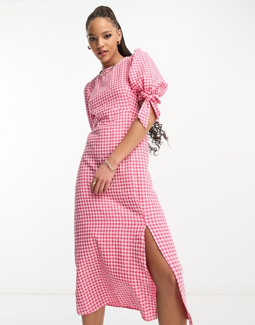 Nobody's Child - Esme - Midikjole med bindebånd på ærmerne i pink og røde gingham-tern