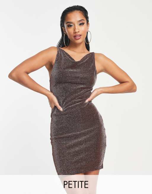 Noisy May Petite - Skinnende kobberfarvet cami-minikjole med vandfaldsudskæring