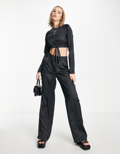 Noisy May - Sort sæt med top med bindedetalje og bukser med vide ben i sort