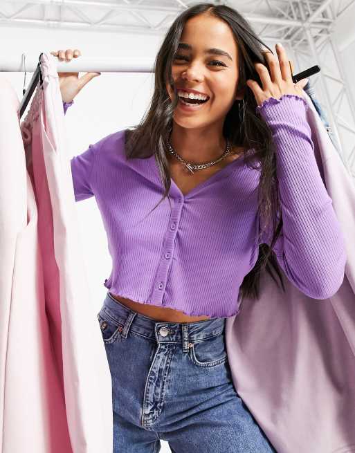 Noisy May - Cropped cardigan med knapper i lilla bomuld - PURPLE