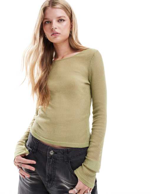 Noisy May - Gennemsigtig og ribstrikket top med lange ærmer i salviegrøn