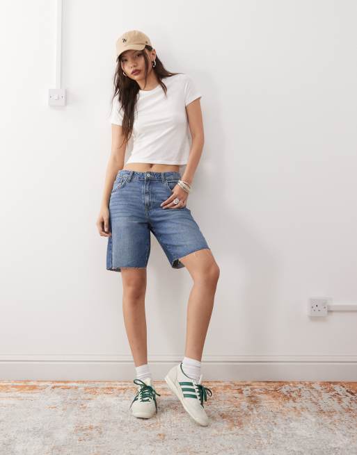 Noisy May - Mellemvasket blå posede denimshorts med høj talje