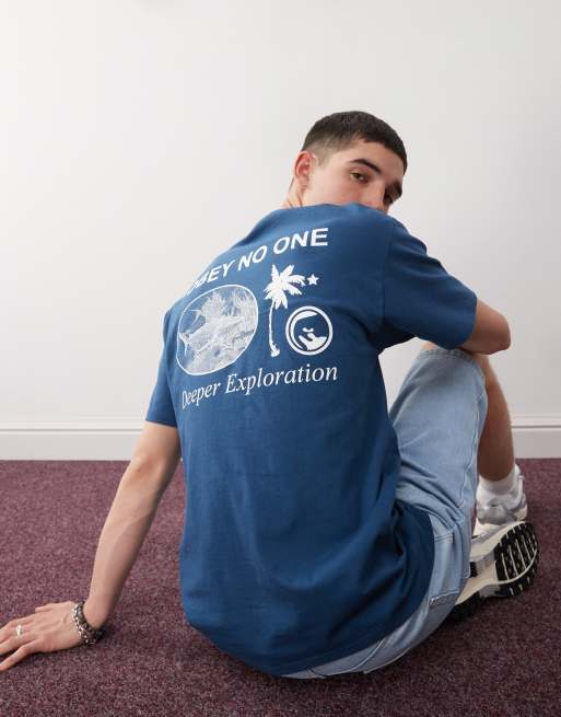 Obey - Blå T-shirt med logografik og 'Deeper Exploration'-print