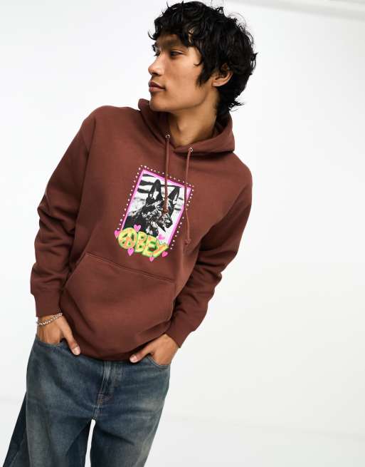 Obey - Brun hættetrøje med print med fredshund