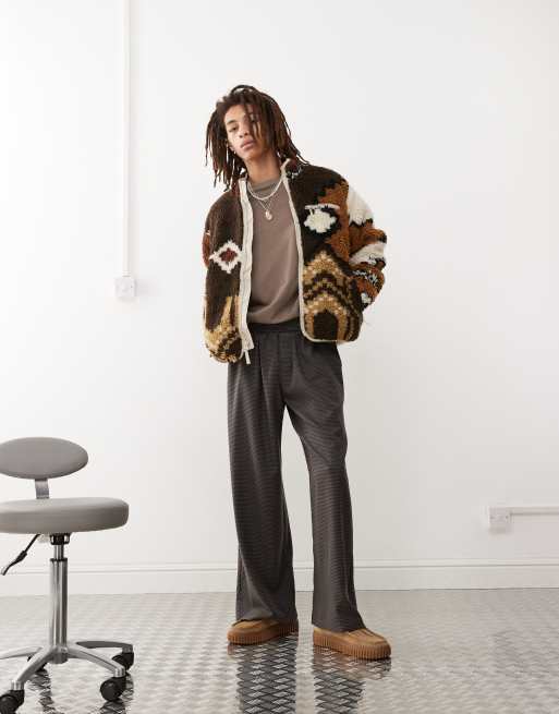 Obey - Brun jakke i sherpa-fleece med marokkansk tæppemønster