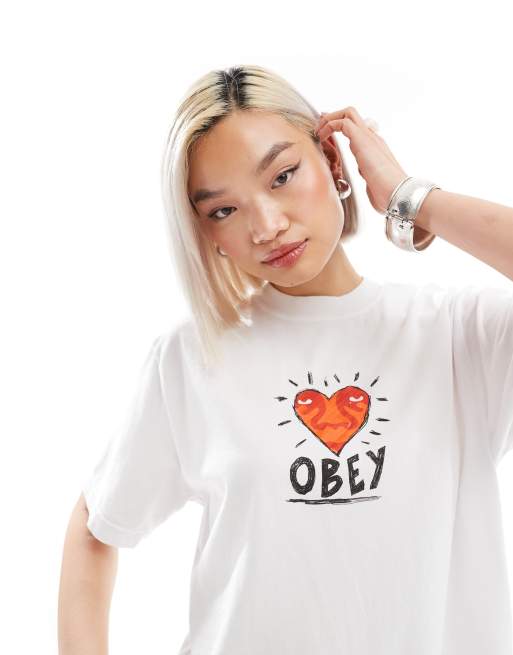 Obey - Hvid T-shirt med korte ærmer og hjertegrafik