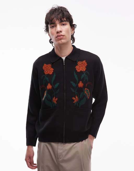 Obey - Sort cardigan med lynlås og blomstermønster