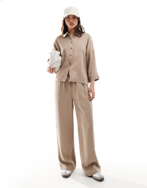Object - Blødt sæt med skjorte med brede ærmer og bukser med løbesnor i beige
