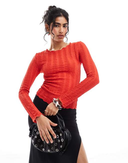 Object - Flammerød top i jersey med tekstur og bådudskæring