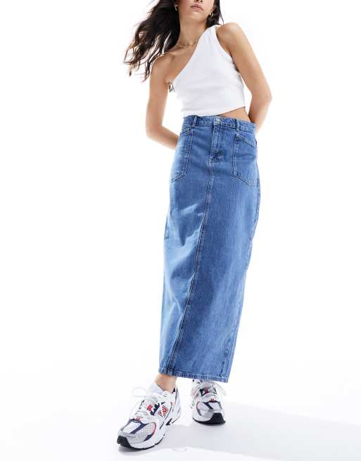 Object - Maxi-denimnederdel i mellemblå vask med dobbelt linning