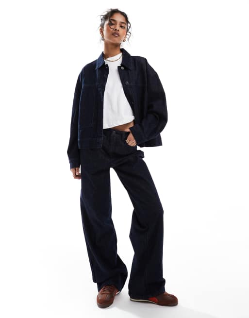 Object - Mørkeblåt denimsæt med jakke og jeans med vide ben med opsmøg og stribedetaljer