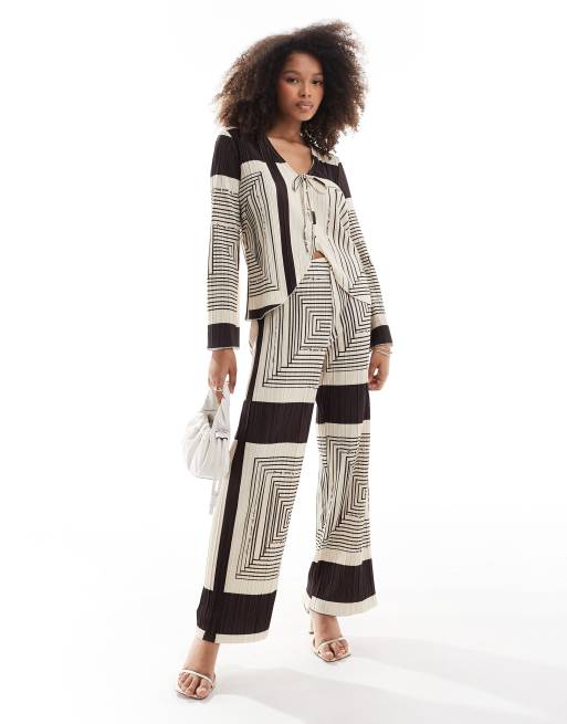 Object - Sæt med plisseret top med bindebånd fortil og bukser med vidde i brunt og abstrakt print