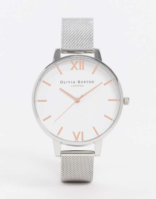 Armbåndsur med flettet lænke i sølv og stor hvid urskive fra Olivia Burton