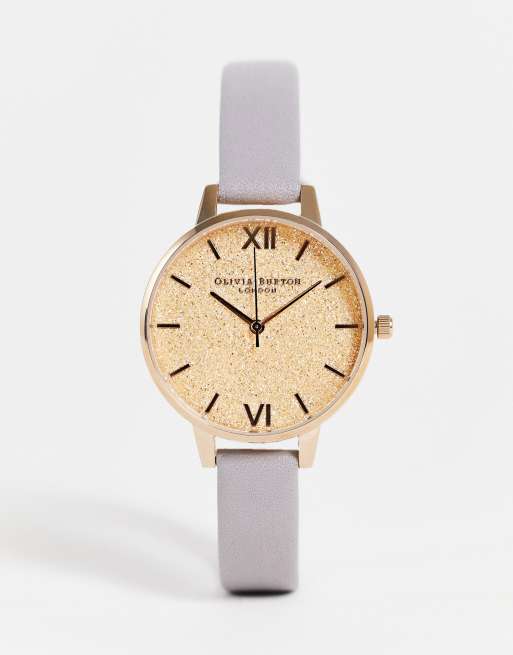 Olivia Burton - Armbåndsur med skive i rosaguld og ægte læderrem i grålig lyslilla