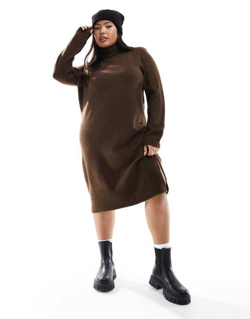 Only Curve - Strikket brun kjole med rullekrave