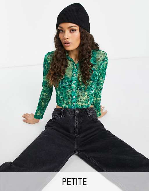 Only Petite - Grøn 70'er skjorte i mesh med blomstermønster