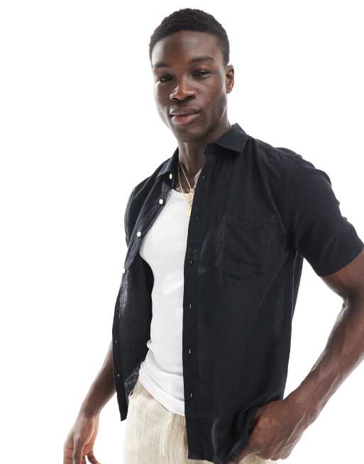 ONLY & SONS - Sort skjorte med korte ærmer i hørblanding i regular fit