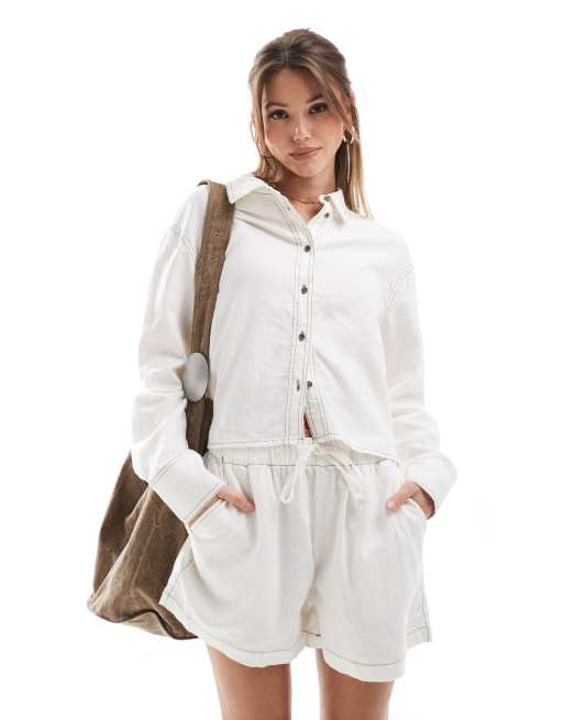 ONLY - Hvid og cropped skjorte i hørblandingsmateriale med syninger i kontrastfarve - Del af sæt
