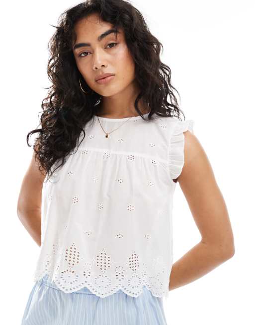 Only - Hvid top i pointelle med flæseærmer