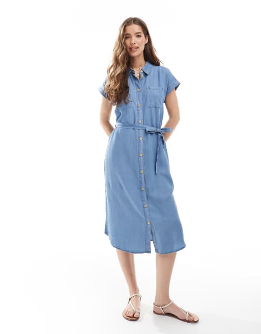 ONLY - Mellemblå midi-skjortekjole i let denim