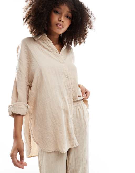 ONLY - Oversized skjorte i lys beige ostelærred - Del af sæt