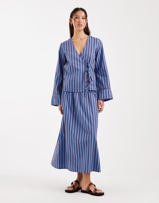 ONLY - Sæt med skjorte med bindebånd foran og midaxi-nederdel med blå/chokoladebrune striber