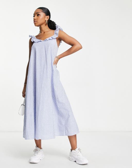 Only - Stribet midikjole med flæsestropper i hvid og blå