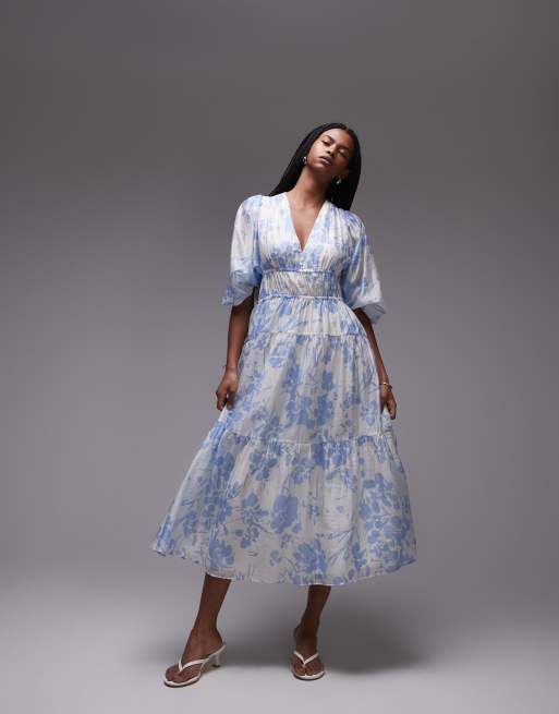 & Other Stories - Blå midaxi-kjole med voluminøse ærmer og rynket overdel i blomstermønster