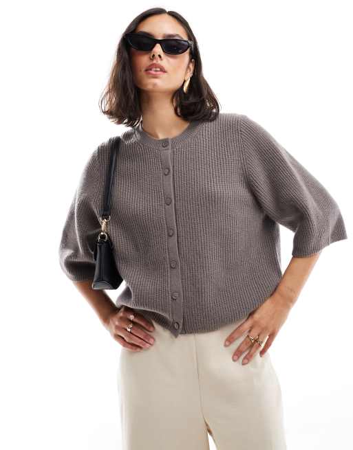 & Other Stories - Mørk beige cardigan i ribstrik i uld med korte ærmer