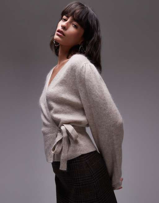 & Other Stories - Muldvarpebrun slå-om-cardigan med pufærmer i pelset garn i mohair- og uldblanding