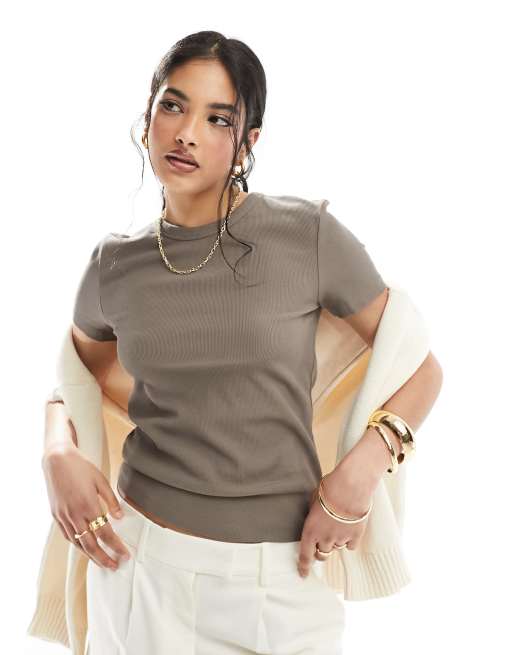 & Other Stories - Tætsiddende og gråbrun top i ribstrik med korte ærmer