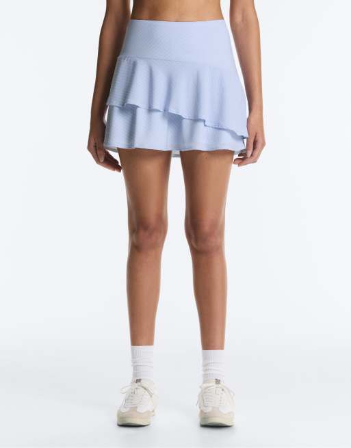 OYSHO - Blå kort nederdel med flæser og striber