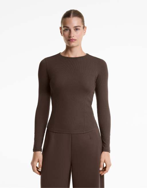 OYSHO - Brun ribstrikket T-shirt med lange ærmer i bomuld og modal