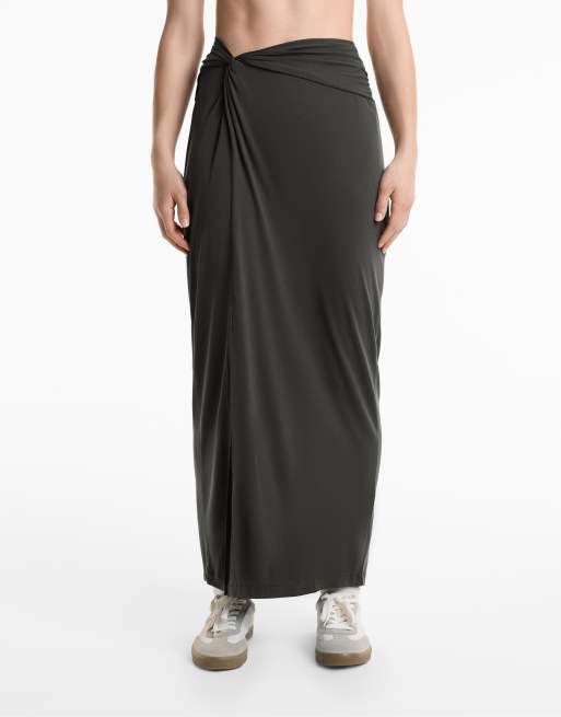 Oysho - Mørkegrå flagrende midinederdel med knude i modal