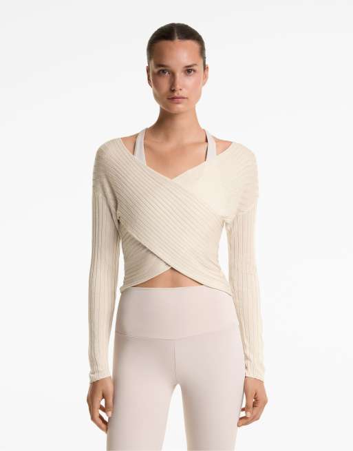 OYSHO - Semi-gennemsigtig trøje i fin bleg lyserød ribstrik med krydset front
