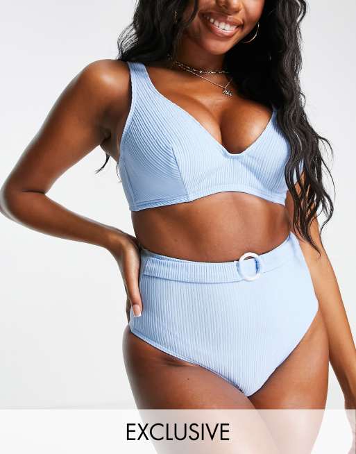 Peek & Beau - Fuller Bust - Højtaljede blå bikinitrusser med høj benskæring og bæltedetalje i ribstrik - Kun hos ASOS