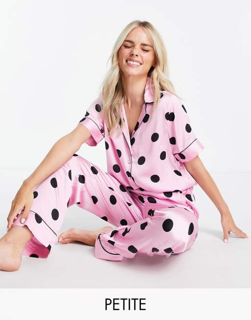 Pieces Petite - Lyserødt pyjamassæt med skjorte og bukser med polkaprikker i satin
