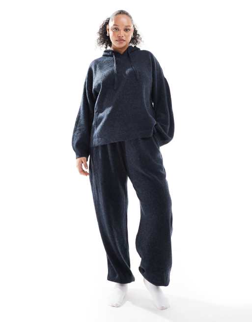 PIECES Curve - Marineblåmeleret hyggesæt med strikket hættetrøje og joggingbukser med tætsiddende buksekanter