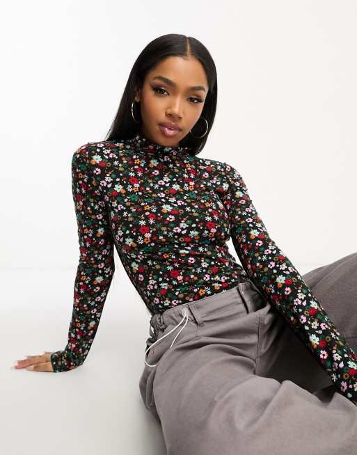 PIECES - Alison - Sort top med rullekrave og blomstermønster