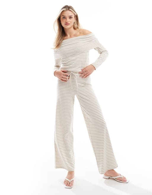 Pieces - Beige og ribstrikket sæt med bandeau-top og bukser med vide ben og striber