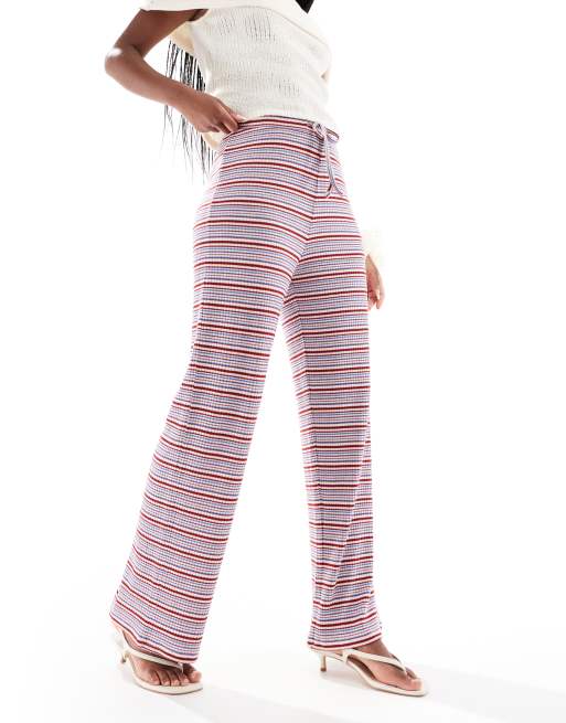 Pieces - Blå og bordeaux ribstrikkede bukser med vide ben og striber