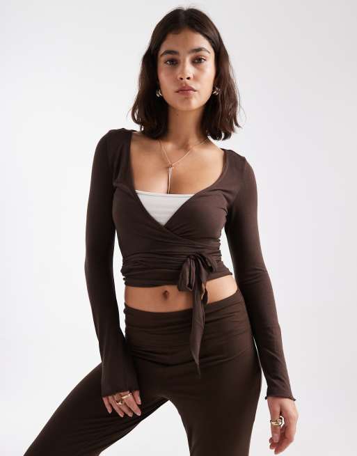 PIECES - Chokoladebrun slå om-top i ballerinastil - Del af sæt