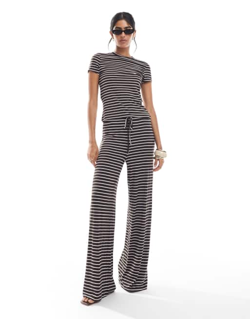 Pieces - Chokoladebrunt sæt med lyserøde striber bestående af T-shirt og bukser med vide ben i jersey