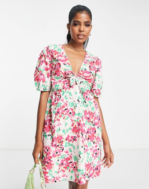 PIECES - Hvid minikjole med pufærmer og bindebånd i blomstermønster