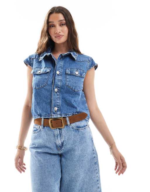 Pieces - Mellemblå og cropped denimtop med afkortede ærmer