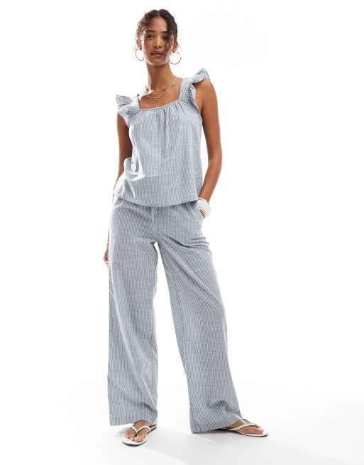 Pieces - Mix og match - Blå bukser med bindetalje, vide ben og striber i bomuld