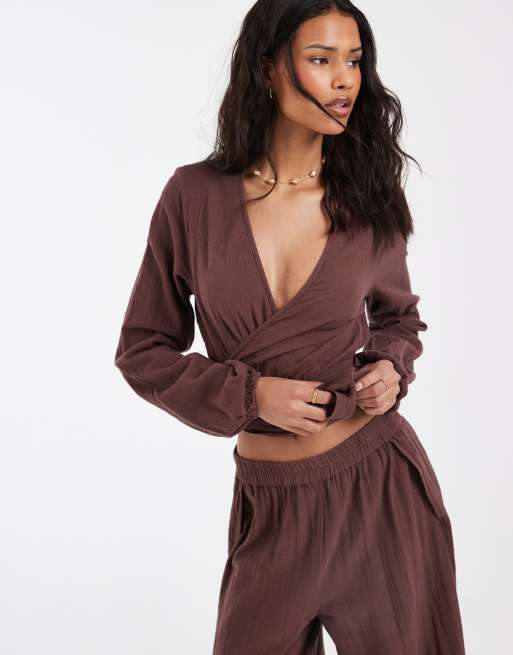 PIECES - Tekstureret bomuldstop i mørk mahognibrun med lange ærmer og bindefront - Del af sæt