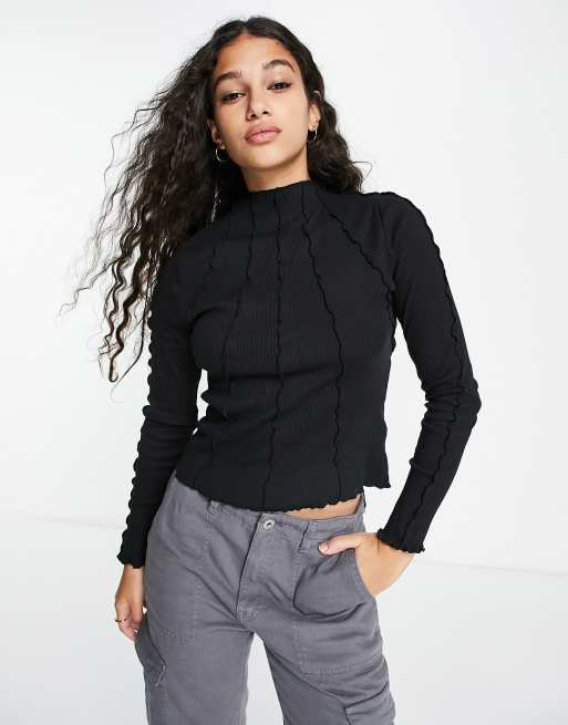 Pimkie - Langærmet sort top med kontrastfarvede sømdetaljer