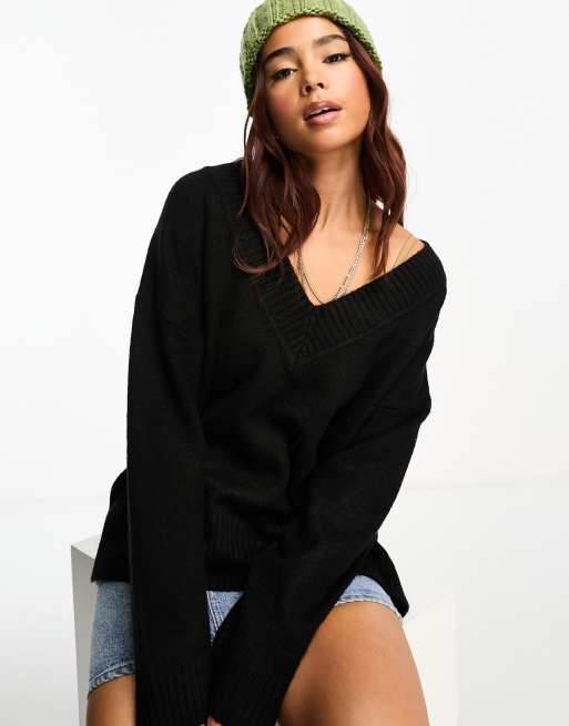Pimkie - Sort longline-trøje med V-hals i uldblanding