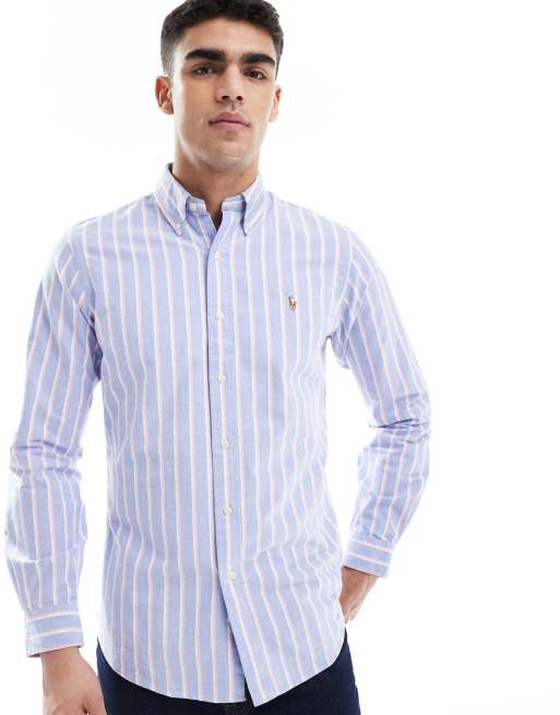 Polo Ralph Lauren - Blå og pink Oxford-skjorte med logoikon og striber i figursyet pasform